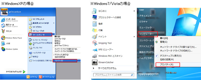 スタートメニューからマイコンピューター(7、Vistaの場合はコンピューター)を右クリックしプロパティを選択します