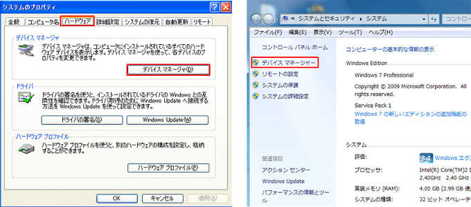 ハードウェアタブをクリック、デバイスマネージャーをクリックします(7、Vistaの場合は画面左のデバイスマネージャーをクリックします)