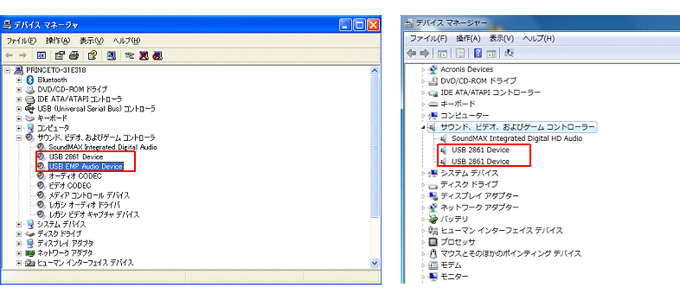 サウンド、ビデオ、およびゲームコントローラデバイスを選択し、「USB EMP Audio Device」または「USB 2861 Device」があるか確認します。