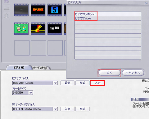 ビデオデバイスの「入力」をクリックしボックスを表示させます。