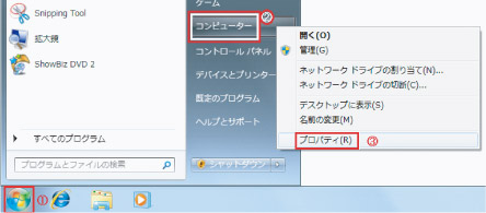「スタート」→「コンピュータ」を右クリックし「プロパティ」を選択します。