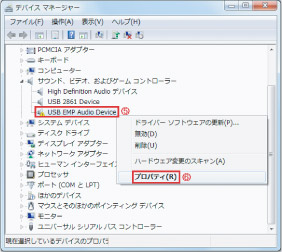 「デバイスマネージャ」の“!”マークの付いた「USB EMP Audio Device」を右クリックし「プロパティ」を選択します。