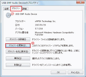 デバイスドライバーの更新を行ったにもかかわらすデバイスマネージャ表示名が「USB EMP Audio Device」のままの場合があります。