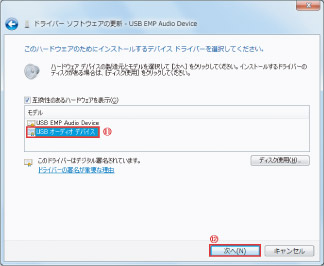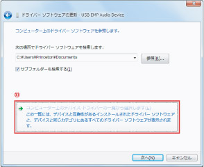 ドライバの選択画面が表示されますので「USB オーディオデバイス」をクリックして「次へ」ボタンをクリックします。