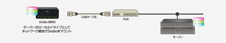 iSCSI対応Droboとサーバーをネットワーク接続し、iSCSIプロトコルで接続することにより、Droboをローカルドライブのように使用することができます。サーバーデータの保存領域として、またバックアップソフトウェアの併用によりサーバーデータのバックアップ領域としてDroboをご活用いただけます。