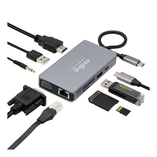 UB-CDOC9は9つの機能を搭載したオールインワンドッキングステーションです。 USB Type-Cコネクターを搭載したパソコン等※に、これ1つでいろいろな機器をつなげることができます。 「HDMIポート」、「VGAポート」、「LANポート」、「USB3.2 Type-A 2ポート」、 「3.5mm3極ミニプラグ」、「Power Delivery対応Type-Cポート」、「SDカードスロット」 、「microSDカードスロット」の機能を拡張できます。