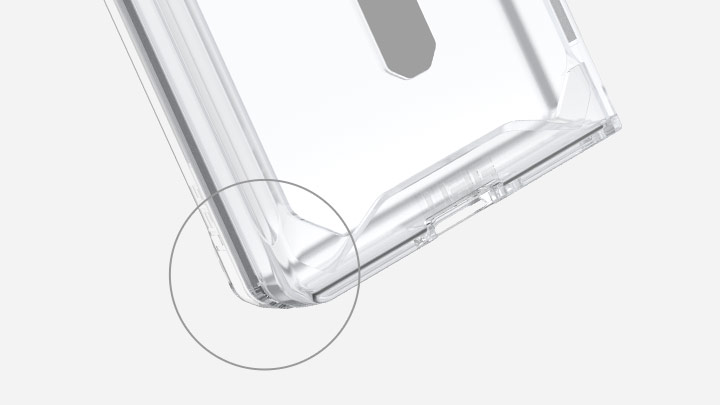 落下時、最も衝撃を受ける角の部分にエアクッションを搭載。やわらかな空気のクッションが衝撃を緩和し、スマートフォンを保護します。